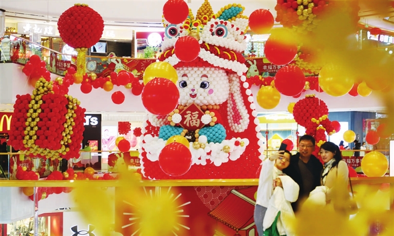 1月17日,省城解放路某大型商场内,用气球制作的“兔儿爷”营造了浓浓年味儿,吸引市民购物休闲。张昊宇 摄