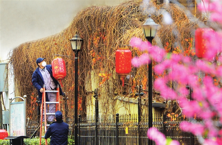 春节临近,1月18日,迎泽南街一小区内,工作人员正在挂灯笼,处处洋溢着浓浓的“年味”。