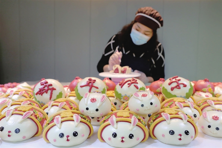 1月19日,淮北市一家果蔬面艺美食坊的面点师在制作“萌兔”花馍。春节临近,安徽省淮北市一些面点师以兔为主题,创作出各式各样的“萌兔”花馍,供应节日市场,迎接新春佳节的到来。新华社发 (万善朝 摄)