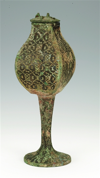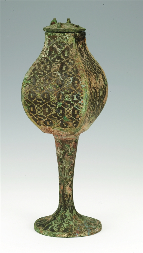 出土于太原赵卿墓的高柄小方壶,上绘龙与凤的形象,寓意圆满、美满。赵卿墓是迄今为止发现的春秋时期等级最高、规模最大、随葬品最丰富的高级贵族墓葬。高柄小方壶共出土两件,大小、形制、纹饰相同,壶身饰菱形和几何纹图案,高柄和圈足饰三组神鸟纹,可看作抽象的龙与凤,其昂首阔步,寓意深奥。