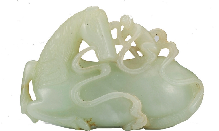 白玉马上封侯带扣中的“马上封猴(侯)”,是明清时期玉雕的常见题材,造型为一只猴子骑在马身上。“猴”与“侯”谐音,表达官运亨通、平步青云之寓意。