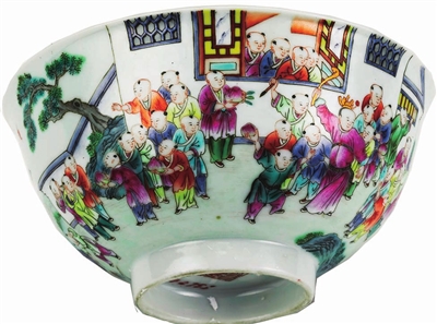 清代粉彩婴戏图碗,让我们身临其境百年前过大年的热闹场景。碗身外壁通体绘婴戏图,以房舍、山石、树木、小桥、流水为背景,绘婴孩62人,画面中细节表现出许多吉祥的寓意:小童放爆竹,除旧岁迎新春;小童手中高举的桃子,蕴含“桃献千年”;桥边的五只蝙蝠是“五福临门”。这些寓意吉祥的细节与作品整体欲表现的理念高度一致,可谓“福上加福”。