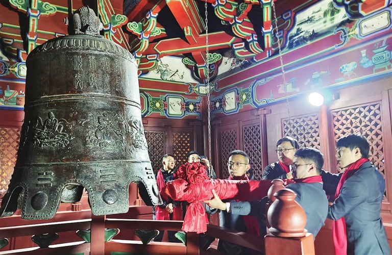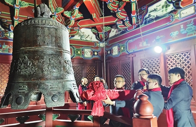 1月22日,农历正月初一零时整,市民在钟楼街钟楼上撞钟祈福,辞旧迎新。张昊宇 摄