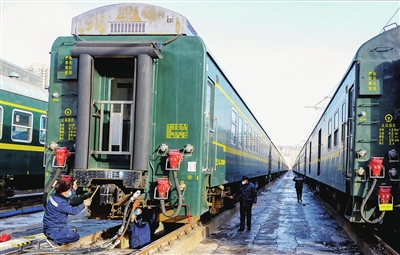 春节假期,中国铁路太原局集团公司太原车辆段加大对旅客列车的整修力度,保证列车运行安全。图为1月27日工作人员正在检修列车。牛利敏 宋卫东 摄