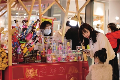 1月27日,省城某商场的新春市集上,传统非遗与时尚商品相结合,让市民感受浓郁的国潮氛围。王韵菲 摄