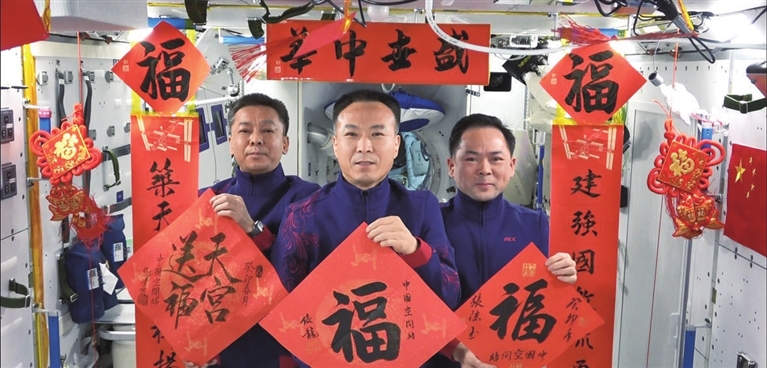 问天舱内,3名航天员特意穿上了“祥云服”,迎接中国空间站全面建成后的首个除夕。“鸿运当头”椒麻鹅,“金玉满堂”松仁玉米,“势如破竹”酸辣笋……航天员张陆说:“穿新衣、吃饺子、送祝福,这些年俗年味儿可一样也不少。”