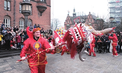 图②:1月21日,人们在丹麦首都哥本哈根市政广场观看舞龙表演。