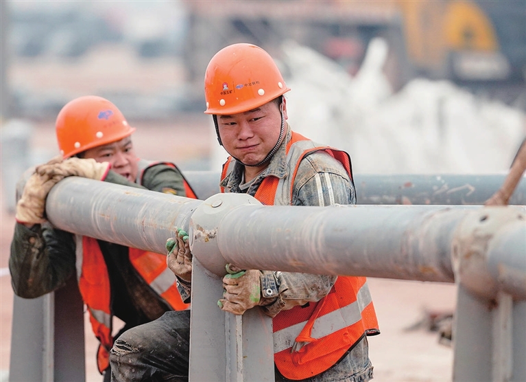 图③:工人在重庆两江新区新能源汽车产业园基础设施配套项目现场进行钢结构材料拼装作业(1月23日摄)。
