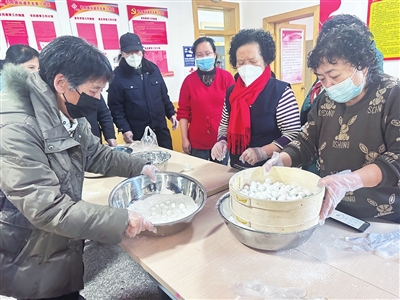 1月31日,平阳路街道平北西一社区新时代文明实践站内热闹非凡,社区街坊邻里齐聚一堂,共同了解元宵节民俗、动手滚元宵,用自己的方式庆祝元宵佳节。活动中,社区志愿者一边向社区居民讲解元宵节的来历和习俗,一边讲解滚元宵的制作步骤。揉面团、切剂子、包馅儿……很快,一个个雪白的糯米小球被放入盛有糯米粉的大盆中,看着小小的元宵渐渐变大变圆,现场不时传来欢呼声和笑声。