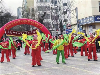 春节假期过后,庙前街社区就开始筹划社区文艺演出。时间紧任务重压力大,大家纷纷投入进来。退休职工潘晓萍帮忙组织居民秧歌队,社区干部、网格员们全员上阵,大家一遍遍帮节目进行编排,一次次推翻重来,40多人不厌其烦,反复排练……在当天上午作为压轴节目登场后,伴着传统的节庆鼓乐,两位“财神”带领着表演方队喜庆入场。“财神”们向围观群众分发糖果,观众们笑着你争我抢,都希望沾点好彩头。紧随其后的,活灵活现的划旱船、憨态可掬的小毛驴、活泼好动的大头娃娃依次登场,大家表演的同时,还不忘和观众进行互动……表演者们一个个精神抖擞,喜气洋洋,舞出了年味,舞出了新春的喜悦。(韩 睿、闫慧娟 文/摄)