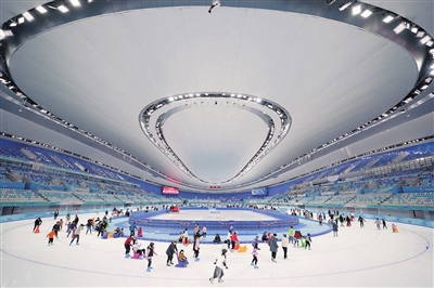 今年春节假期,国家速滑馆“冰丝带”,这座北京冬奥会冠军高亭宇创造历史的地标场馆热闹非凡——冰场外,等待取冰鞋的游客排起了数十米的长队,冰面上,不同水平的滑冰爱好者尽情驰骋。
