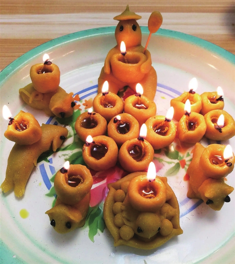 儿时村里捏灯盏盏,母亲心灵手巧,捏得灯盏盏有满堂红、满炕炕、打炭孩、看油猴猴、看门狗狗、照窖狗、烤火盆孩儿,小巧玲珑,栩栩如生,还有口含硬币的钱龙神、牵马驮袋子的仓官爷,真是琳琅满目,大饱眼福。母亲把捏好的灯盏盏放在篦子上、案板上,生龙活虎,看起来分外喜人。过去用龙须草缠麻纸做灯芯,也有用棉絮搓成捻子搭在灯盏沿沿上,用胡麻油或熟猪油做灯油。母亲还对我们说,这里面满堂红是主灯,一般在背上捏五个灯盏,顶端一盏,中腰一圈四盏,象征着五子登科,也企盼一年走好运、发大财。