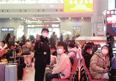 2月9日,受降雪影响,太原南站乘车的旅客增多。车站派出所民警主动服务,疏导旅客,保证旅客安全有序出行。