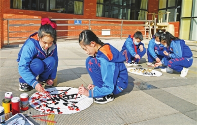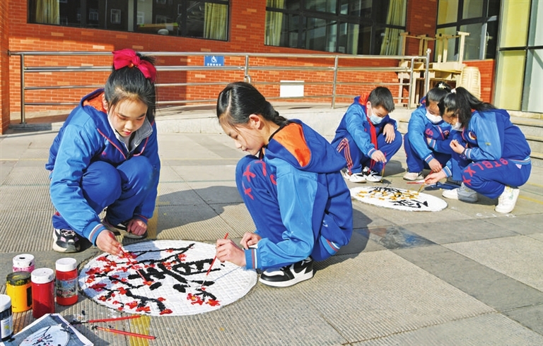 2月11日,迎泽区双塔北路小学学生在绘制井盖画。该校开展以“清廉校园”为主题的创意涂鸦活动,传播向廉向善力量,让清廉文化走进课堂、浸润校园、滋养心灵。李学军 摄