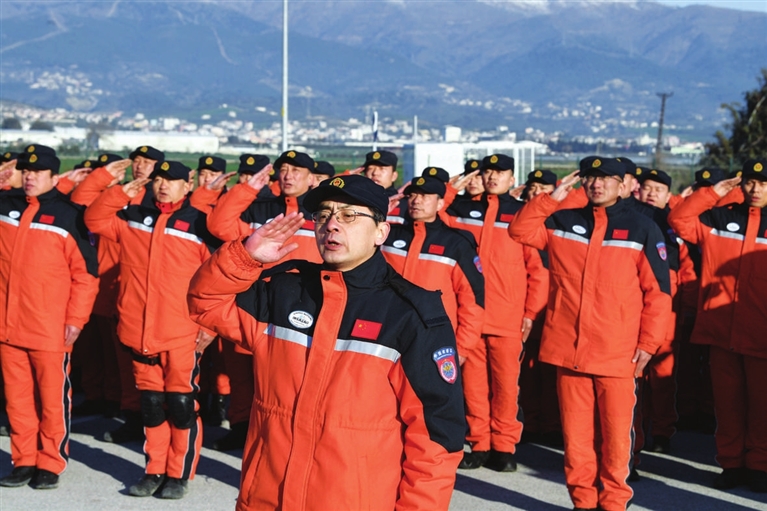 上图:2月10日,中国救援队队员在土耳其哈塔伊省安塔基亚市的驻扎营区参加升旗仪式。