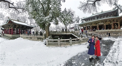 2月12日,一夜春雪将晋祠装扮得分外妖娆。一大早,游客纷至沓来,访古赏雪,留下美好记忆。宿晓健 摄