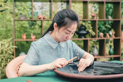 工作室长桌上,摆放着十几件未完成的刻瓷作品。“这是学生们正在创作的作品,开学后接着完成。”今年已经是她在聋人学校开课的第六年,有100多名学生追随她迈入刻瓷创作领域,拥有了一项属于自己的技能。