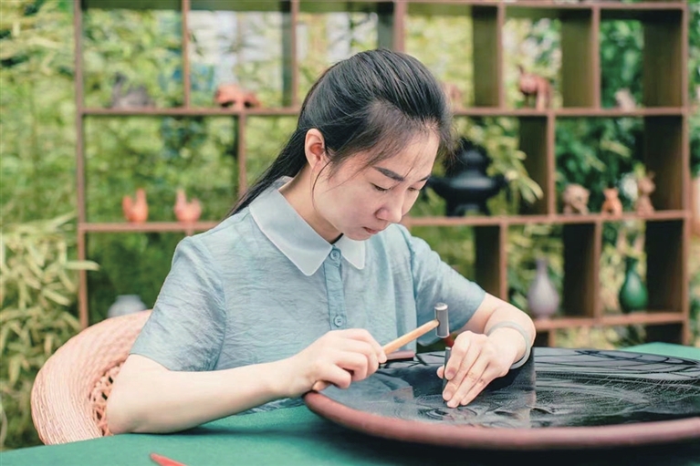 一把刻刀、一柄小锤,常年单调的叮叮咚咚声,在她耳畔却如音乐相伴,日复一日、年复一年,沉浸在自己的创作世界……