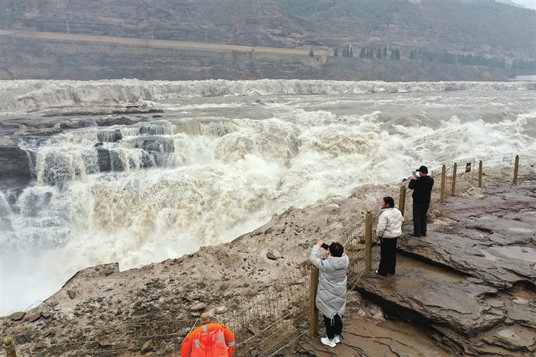 近日,受气温回暖影响,位于山西省吉县和陕西省宜川县交界处的黄河壶口瀑布冰消河开,再现奔腾咆哮的壮美景观。受前一段时间凌汛影响,关闭了半个月的壶口瀑布景区于2月12日恢复对外开放。新华社发 (吕桂明 摄)