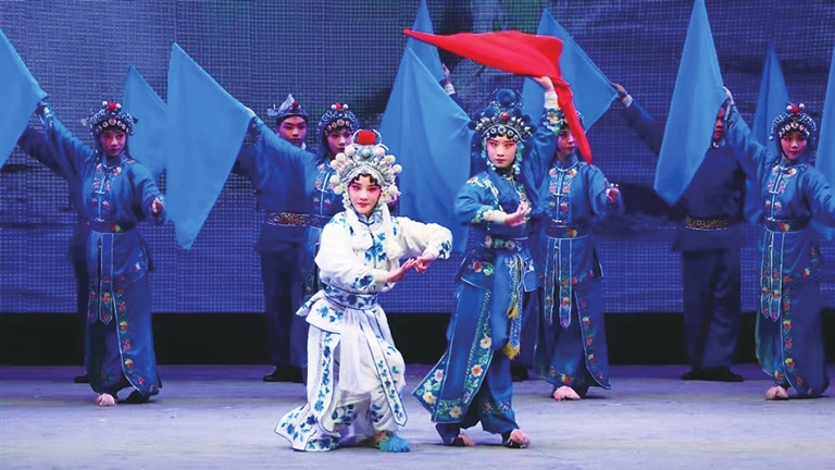 鼓板打响,戏幕拉开,一位冠上插翎、清秀俊朗的小生出现在舞台中央,眼神透露着傲气和心机,开腔一句“一口恶气冲牛斗,孙刘两家结冤仇”高亢清晰,极具穿透力。这是开场戏《黄鹤楼》中周瑜的扮相,演员时而抖翎,时而衔翎,人物性格表现得准确到位,惟妙惟肖。