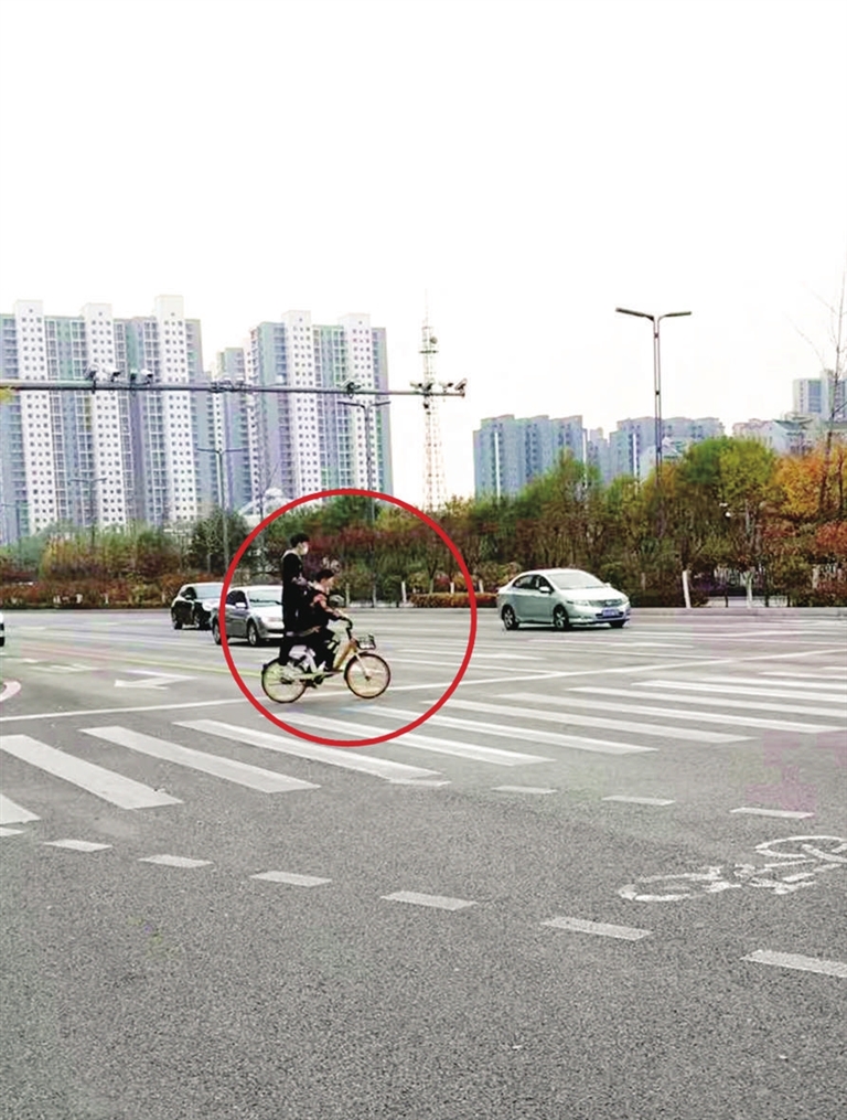 拍摄经过:2月15日上午,我途经新晋祠路与长风西街交叉口东南角时,看到一名小伙子骑着共享单车,另一名小伙子站在他身后脚踩着后轮胎支架。如此骑行不仅会对共享单车造成损坏,还存在安全隐患,真替他们捏把汗。