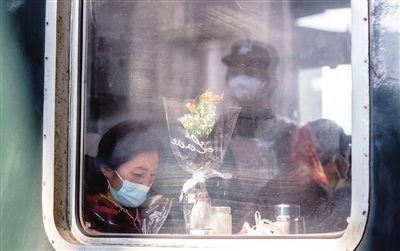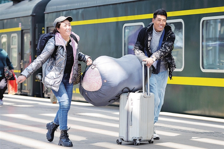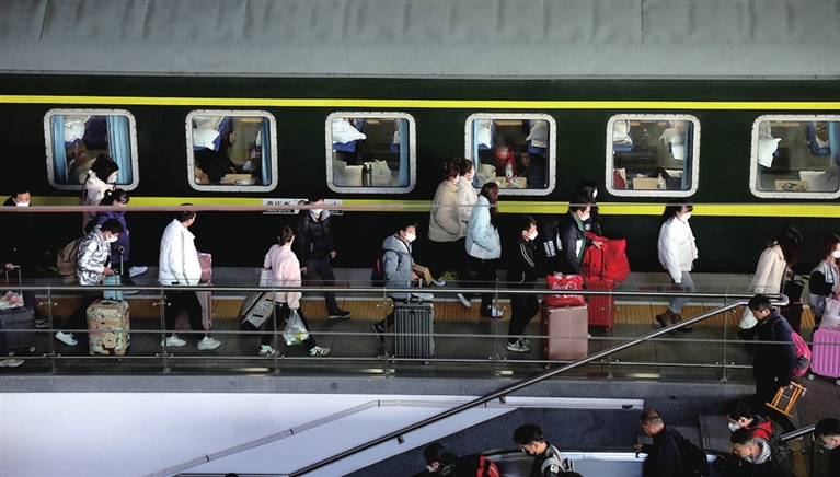 2月15日,旅客在湖北武昌站乘坐列车出行。