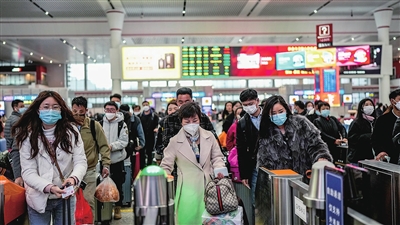 2月15日,旅客在贵阳北站通过闸机准备乘车。