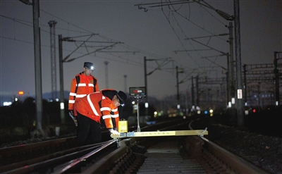 二月十五日凌晨,中国铁路上海局集团有限公司南京桥工段的铁路检修人员在南京南站调试轨道检查仪。