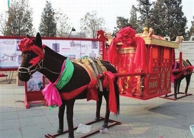 骡驮轿是山西省朔州市平鲁区传统民间婚俗中的一种迎娶工具,并随之形成一定的婚俗习惯。骡驮轿,即骡驮的花轿,是用两头骡子一前一后驮(架)着的轿子。