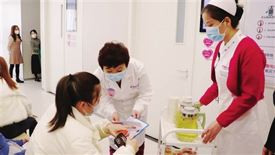 “您好,请问您有什么需要帮助的呢?”“您好,请问您的空腹项目做了吗?”参与一线服务的领导层在检区内耐心地为客户分诊引导、解答疑问,并为做完空腹项目的客户送水、小零食,既解决了客户口渴问题,也利于客户后续憋尿检查项目的进行。