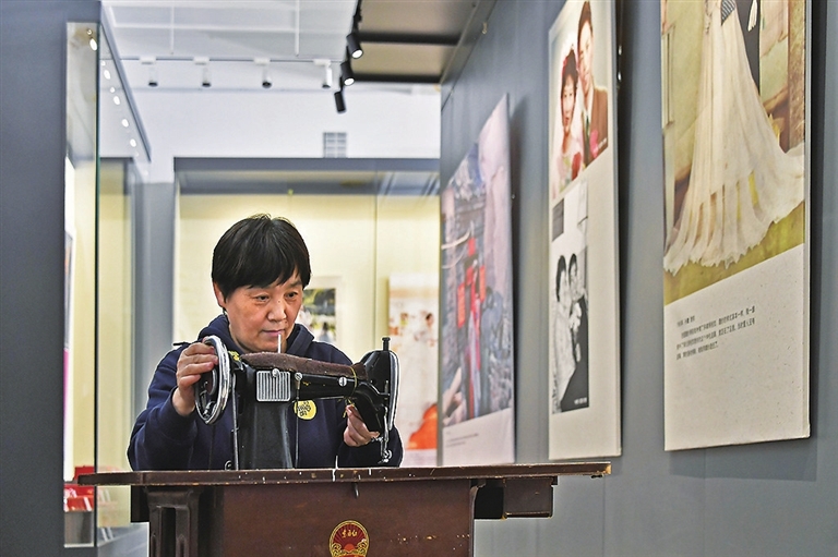 参观者坐在“东方红”牌缝纫机前,随着机器的转动,仿佛又回到幸福的青葱岁月。