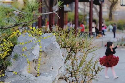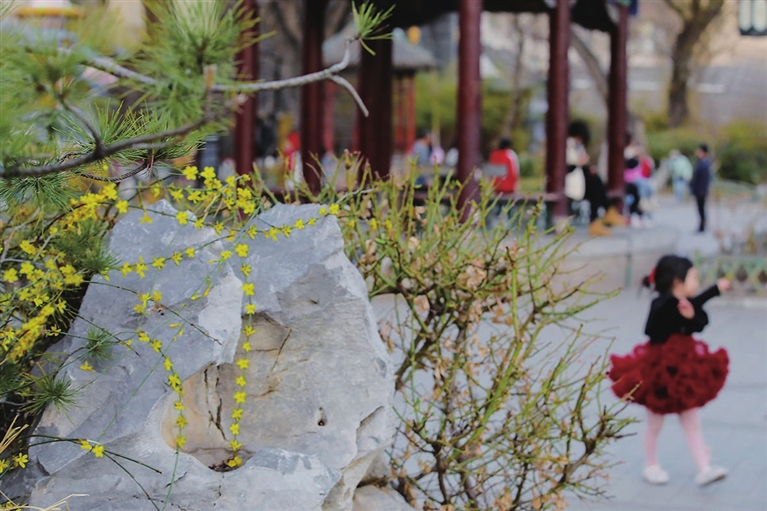 3月23日,文瀛公园的迎春花迎风绽放,与踏春的游人构成一幅温馨的画面。王韵菲 摄
