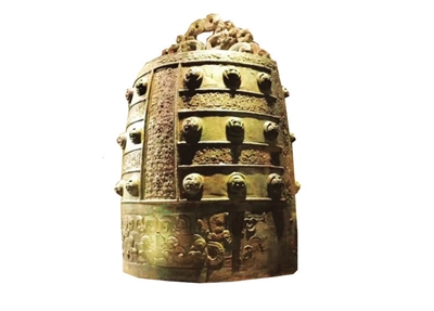 镈钟虽然是三兄弟中最年轻的,但却是乐器中的王者。它流行于春秋战国时期,器形巨大,顶部有复杂的兽形环钮,可单位悬挂,又可成组编镈。声音低沉浑厚,一般用来指挥乐队,控制整体节奏。