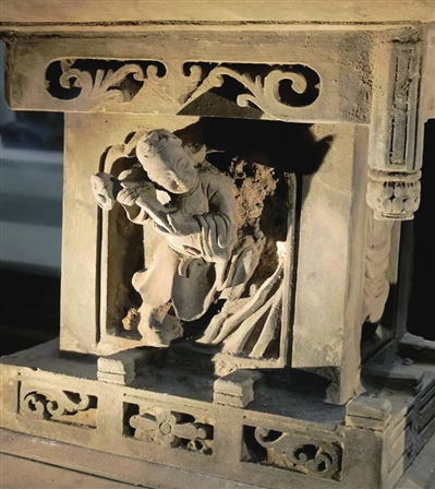 该馆所藏清代墀头砖雕《人生如意》,构思巧妙。砖雕正中,人物头戴花冠,上饰元宝,面容安详喜悦;身着长袍,袖笼宽大,双手持一长柄如意。尤为精妙的是,主体图案处于一个方形“池子”中,前方有突出的仿石围栏,人物身体前倾,仿佛要从“舞台”之中轻踱而出,静中有动,动中有静,生动传神。
