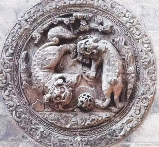 民间有谚:“狮子滚绣球,好事在后头。”狮子滚绣球表好运降临、吉祥喜庆之意。该馆所藏清代《双狮滚绣球》照壁砖雕,趣味横生。砖雕为圆形,中间两头可爱的幼狮首尾相衔,戏耍绣球,造型萌态可掬,活泼生动。旁边饰以花草等图案,精致华美,巧夺天工。