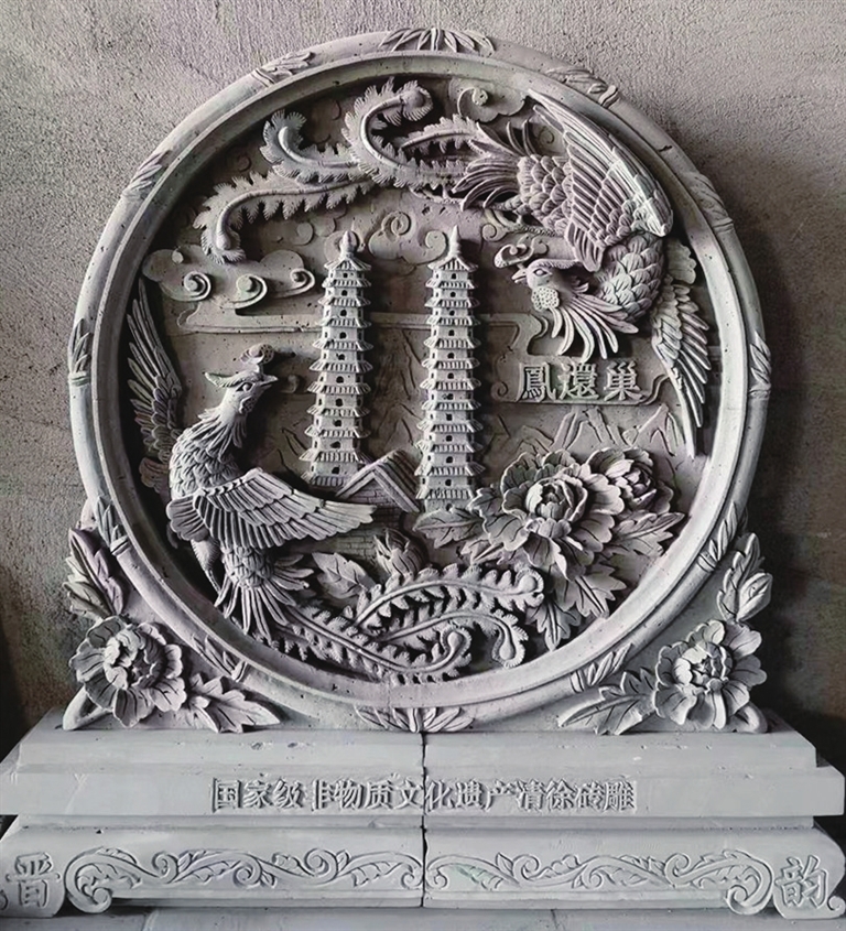 山西民居砖雕技艺国家级非遗传承人韩永胜的现代砖雕作品《凤还巢》清新富丽,气势磅礴。两只凤凰盘旋于天,中间的双塔巍峨耸立,寓意着太原美好的明天。 清徐砖雕历经沧桑,却薪火相传、一脉相承,如今延续着“秦砖汉瓦”的精工细作,在新时代展示着晋式砖雕丰富的艺术魅力。