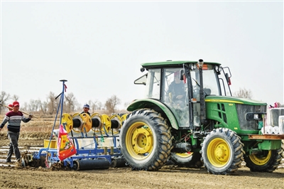 在新疆尉犁县,搭载北斗导航系统的播种机在棉田作业(3月30日摄)。进入3月底4月初,天气渐暖,土壤墒情好,新疆棉花春播自南向北拉开序幕。在新疆麦盖提县、尉犁县等地,当地棉农借助卫星导航、农机等,机械化实施作业,全面开展棉花播种工作。新华社记者 王 菲 摄