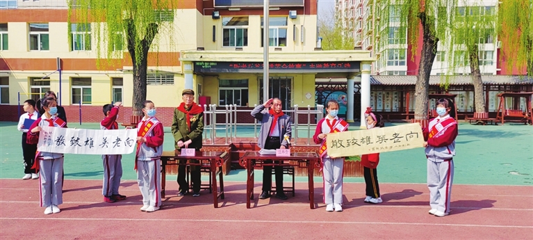 在主题教育环节中,擅长书法的学生代表还向两位老战士赠送了书法作品“向老英雄致敬”,表达少先队员将以老兵爷爷们为榜样,学习尊崇英雄、厚植家国情怀、赓续红色血脉、传承红色基因的决心。