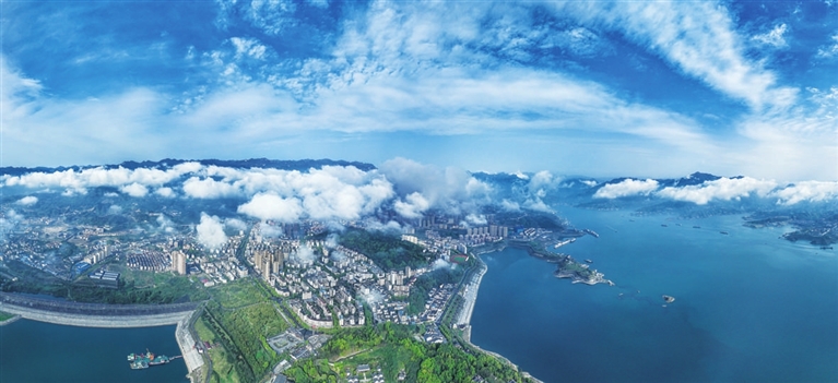 4月6日,船舶行驶在三峡大坝上游湖北省宜昌市秭归县水域(无人机全景照片)。一场春雨过后,长江三峡上空云雾缭绕,如水墨画卷,美不胜收。新华社发 (郑家裕 摄)