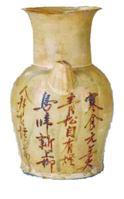 唐代釉下褐彩“寒食元无火”诗文壶,湖南长沙窑遗址出土,长沙市博物馆藏,壶施青釉,釉下用褐彩书写五言绝句:“寒食元无火,青松自有烟。鸟啼新上柳,人拜古坟前。”