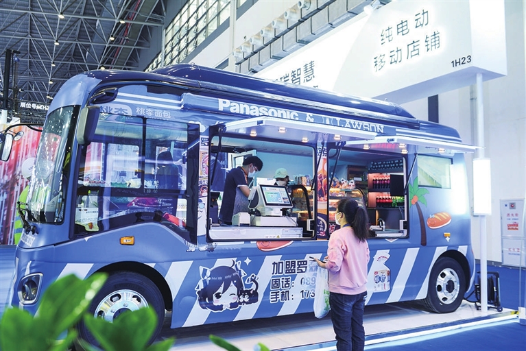 首次参展的某电器公司带来一款纯电动“移动便利店”,不仅搭载了节能厨房设备、使用保温节能材料,还可以作为试点,探索减少因频繁开闭店装修而产生的大量碳排放。