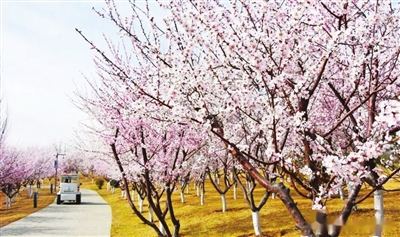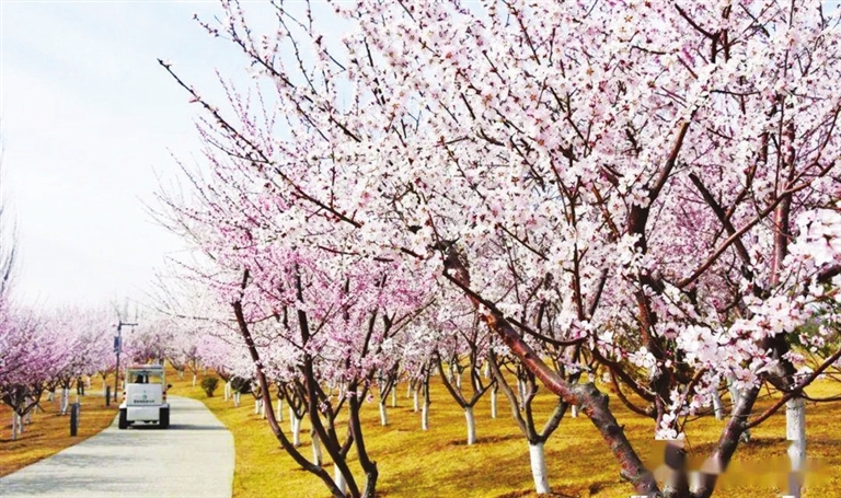 这一条桃花长廊,确实诱人。在大片或浓或淡的粉红中,忽而有几株洁白如云,忽而有几株浅绿如玉,忽而有几株微黄如豆……同是桃花,却也五彩缤纷。不同品种的桃树,高矮有致,枝桠交错,引得游人纷纷驻足拍照,仿佛置身仙境。