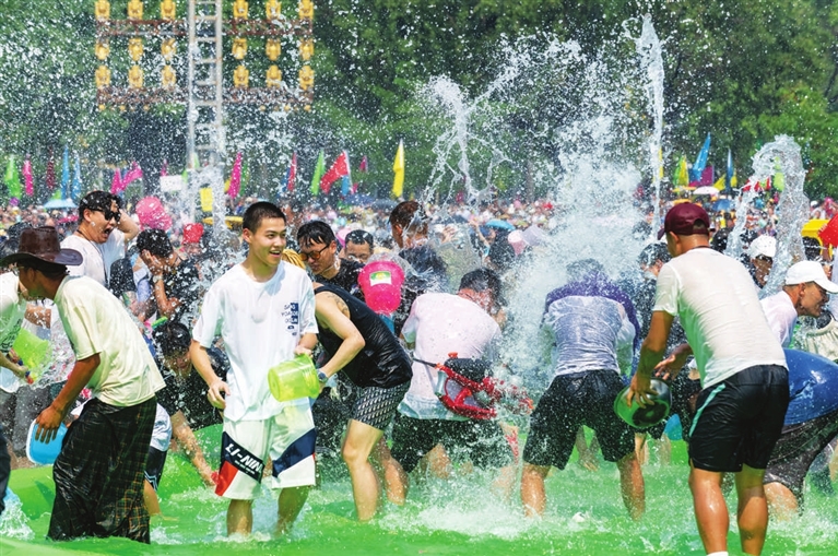 4月12日,人们在芒市广场庆祝泼水节。当日,云南省德宏傣族景颇族自治州芒市2023年泼水狂欢节开幕,人们相互泼洒代表幸福、吉祥的清水,表达着相互间的无限祝福。新华社记者 陈欣波 摄