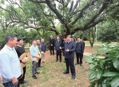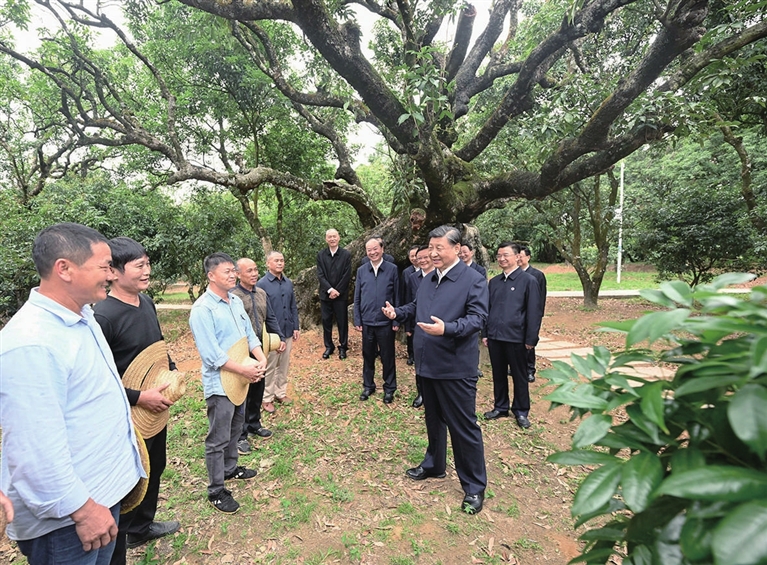 习近平11日来到茂名高州市根子镇柏桥村考察调研。柏桥村种植荔枝约6800亩,是荔枝生产专业村。习近平走进荔枝种植园,了解当地发展特色种植产业和文旅产业等情况,并同现场技术人员亲切交流。随后,习近平来到柏桥龙眼荔枝专业合作社,听取合作社运营和推进乡村振兴等情况介绍。习近平指出,这里是荔枝之乡,荔枝种植有历史传承和文化底蕴,特色鲜明,优势明显,市场空间广阔,要进一步提高种植、保鲜、加工等技术,把荔枝特色产业和特色文化旅游发展得更好。