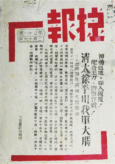 山西博物院藏有一件珍贵的革命文物,这是解放战争期间,晋绥八分区政治部印发的“清太徐平川我军大胜”捷报(以下简称《捷报》)。 《捷报》上方由右至左横向印有鲜红的粗体美术字“捷报”,旁边印有期数“第二十一号”和发布时间“二月十九日”。右上角的印章依稀能看到日期“卅六年”。《捷报》内容竖排,肩题为“神勇迅速,深入敌后!配合主力,机动作战!”主题是“清太徐平川我军大胜”,副题是“十四时扫除阎顽九个据点”。