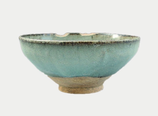 钧瓷碗,黄褐色胎,胎质较粗。直口微敛,弧腹较深,圈足。内外施天青色釉,外壁釉不及底,下部积釉较厚。唇部釉色较浅,呈褐色。足底墨书“张九儿”三字。