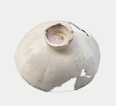 瓷盏,一件为黄白胎,胎质坚硬,敛口,尖唇,浅弧腹,平底,内底施黑釉。另一件为灰胎,胎质坚硬,直口,圆唇,弧腹,圈足,内壁及口部施白色化妆土,然后罩一层透明釉,釉色泛黄,内底有四枚椭圆形支钉痕,圈足上有四处支钉痕,圈足底部墨书“张□□”三字。