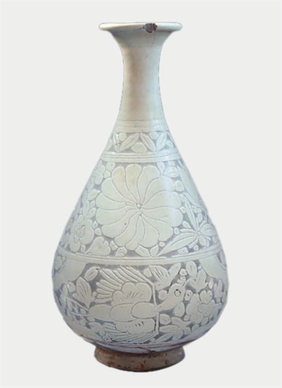 白釉剔花玉壶春瓶,两座墓葬各出土一件,器形相近,造型优美,装饰层次分明,剔花工艺精湛,在以往的考古发掘中较为少见,专家推测可能由太原附近的窑场生产。其中一件比较完整,灰胎,胎质坚硬。侈口,圆唇,细颈,垂腹,圈足。器表施白色化妆土,剔刻出纹饰后,罩一层透明釉。器身上下共三层花纹。最上层为花叶纹;中层为牡丹、荷花、菊花等;下层有两个开光,开光内一面为飞凤,另一面为兔子,开光之间装饰牡丹、荷花。瓶底圈足内有墨书“十”字。另一件破损严重,瓶底圈足墨书“张绳绳记”。