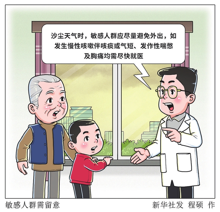 沙尘中悬浮着大量颗粒物,这些细微粉尘过多、过密,易被吸入呼吸道深处,侵害呼吸系统。“躲避沙尘、保护眼睛和呼吸道是沙尘天气个人防护基本原则。”沈阳市疾病预防控制中心应急管理所医师寇瀚文说,老年人、儿童、孕妇、患有呼吸系统疾病及心血管疾病的人群是敏感人群,沙尘天气时,敏感人群应尽量避免外出,如发生慢性咳嗽伴咳痰或气短、发作性喘憋及胸痛均需尽快就医。