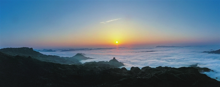 这是4月19日拍摄的金佛山日出时分的云海景观(无人机拼接照片)。